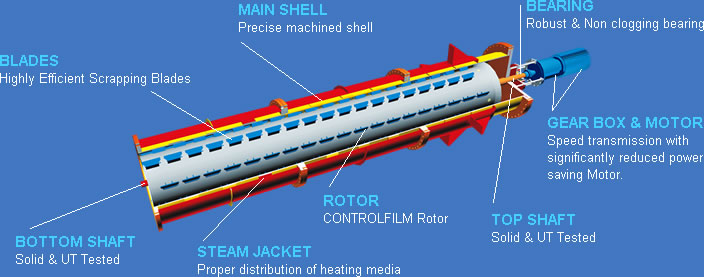 Wet product in form of slurry (range from 30 to 50 % w/w) fed through the inlet nozzle is conveyed steadily by the rotor blades along the heated dryer wall in a thin film (With the help of steam or Hot Oil or any heating media), normally several millimeters thick, preventing buildup and continuously exposing every particle of the product to the heated surface. Vapors pass counter currently to the product flow and exit the dryer through the feed nozzle, as configured above. Moisture levels from a few tenths of a percent up to 5%+ can be achieved. Residence time is typically controlled as per requirement.