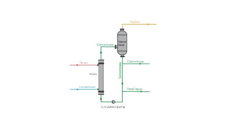 The liquid film moves down the tubes by gravity force. Heat applied through the tube wall effects boiling-off the light fraction from the film. The picture shows a co-current operating evaporator with vapour and liquid leaving the bottom of the evaporator into the separator vessel.